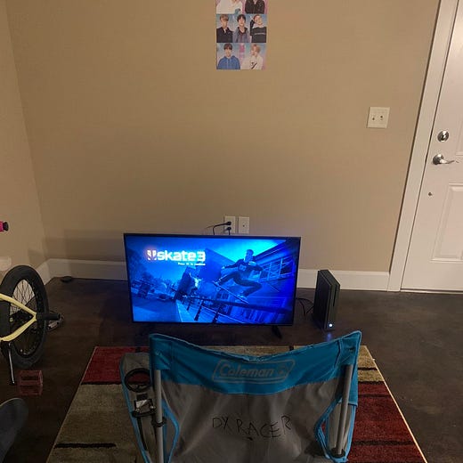 The image this painting is based on is from a tweet posted by popular Twitter user @postedinthecrib that went viral in July 2020. In it, a lone folding camping chair sits in front of a television and gaming console stationed on the ground, a Skate 3 splash page1 glowing on the TV’s screen. This particular home decor aesthetic is one you often see in various states of virality on the internet and is part of a genre that Ryan Broderick described in his Garbage Day newsletter on Monday as “masculine desolation.”